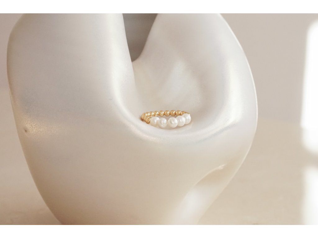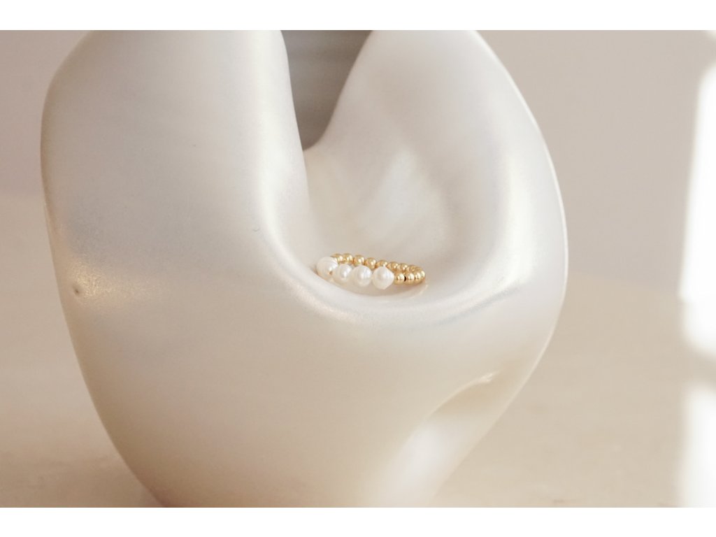 Soft prstýnek z pozlacených stříbrných Ag 925/Au 585 korálků o velikosti jednotlivých komponent 3 mm je doplněn bílými říčními perlami v kvalitě AA a o průměru 4-5 mm.