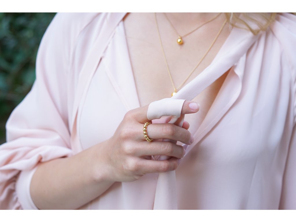 Prstýnek DOTS 4 je sestaven ze stříbrných komponent se 14 karátovým pozlacením o velikosti jednotlivých korálků 4 mm a rytosti Ag 925/Au 585.