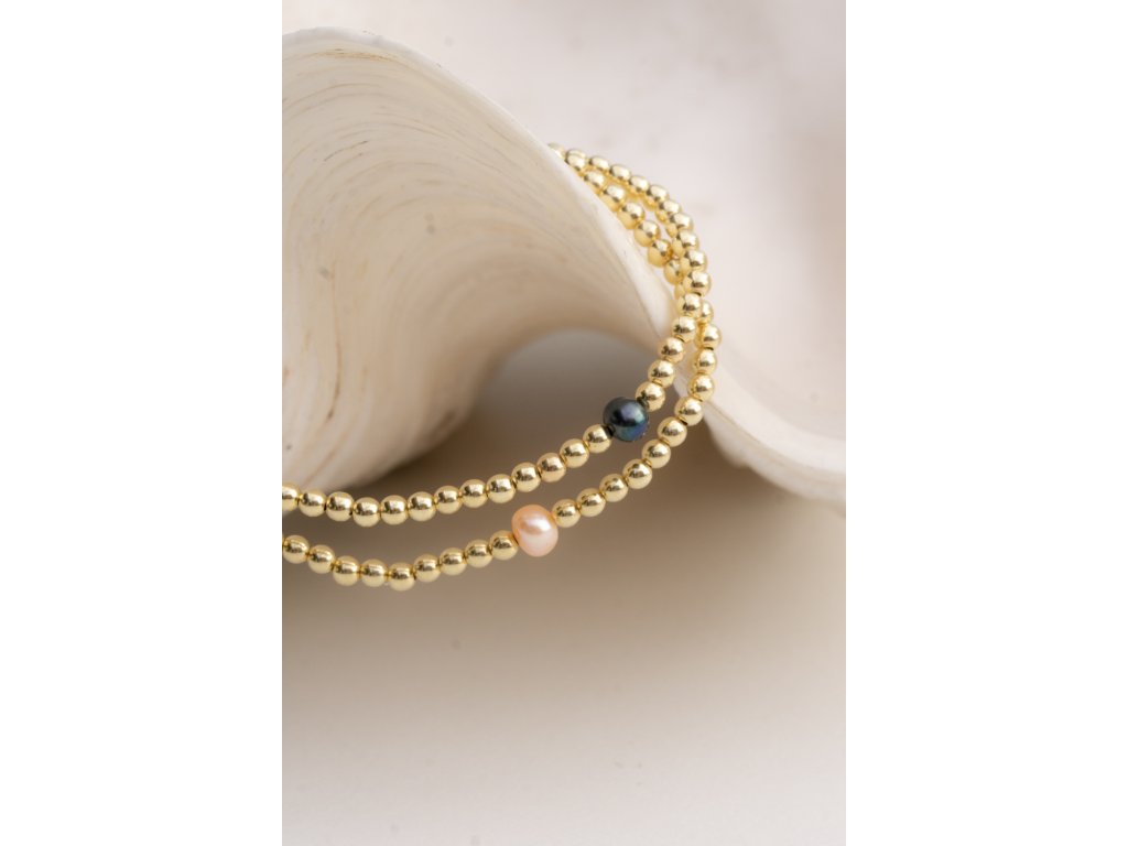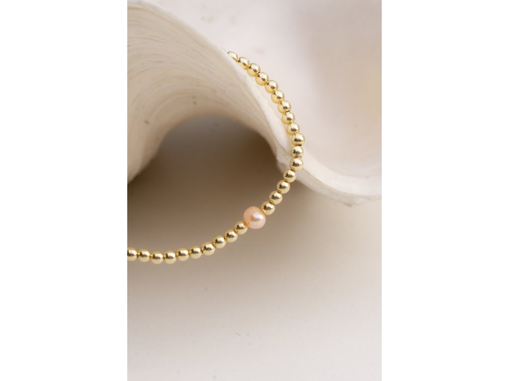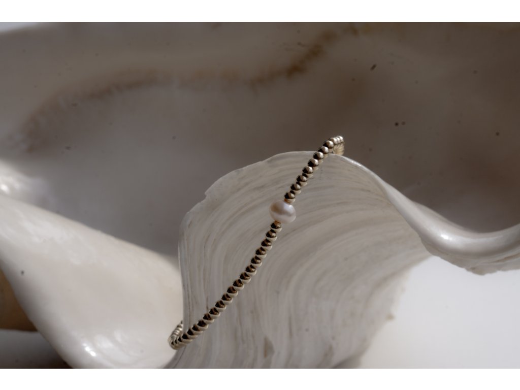 Náramek DOTS PERLA s bílou říční perlou v AA kvalitě a průměru 5 mm. Jednotlivé komponenty jsou pozlacené 14 karátovým zlatem na stříbře o velikosti 3 mm a v ryzosti Ag 925/ Au 585.