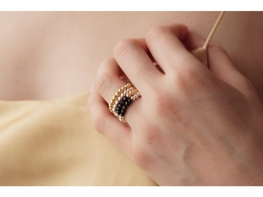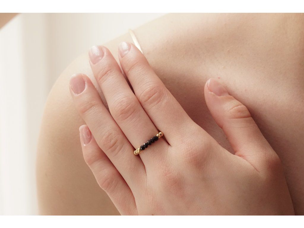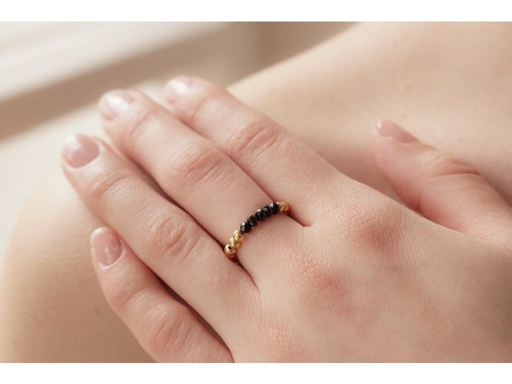 Soft prstýnek z pozlacených stříbrných Ag 925/Au 585 korálků o velikosti jednotlivých komponent 3 mm je doplněn rondelkami spinelu o průměru 3mm. Pro docílení efektu "nastohovatelnosti" prstýnků navštivte prstýnky DOTS.