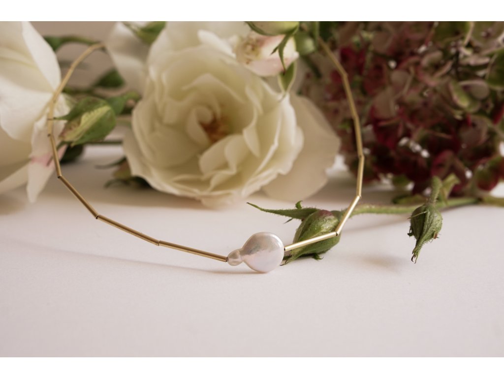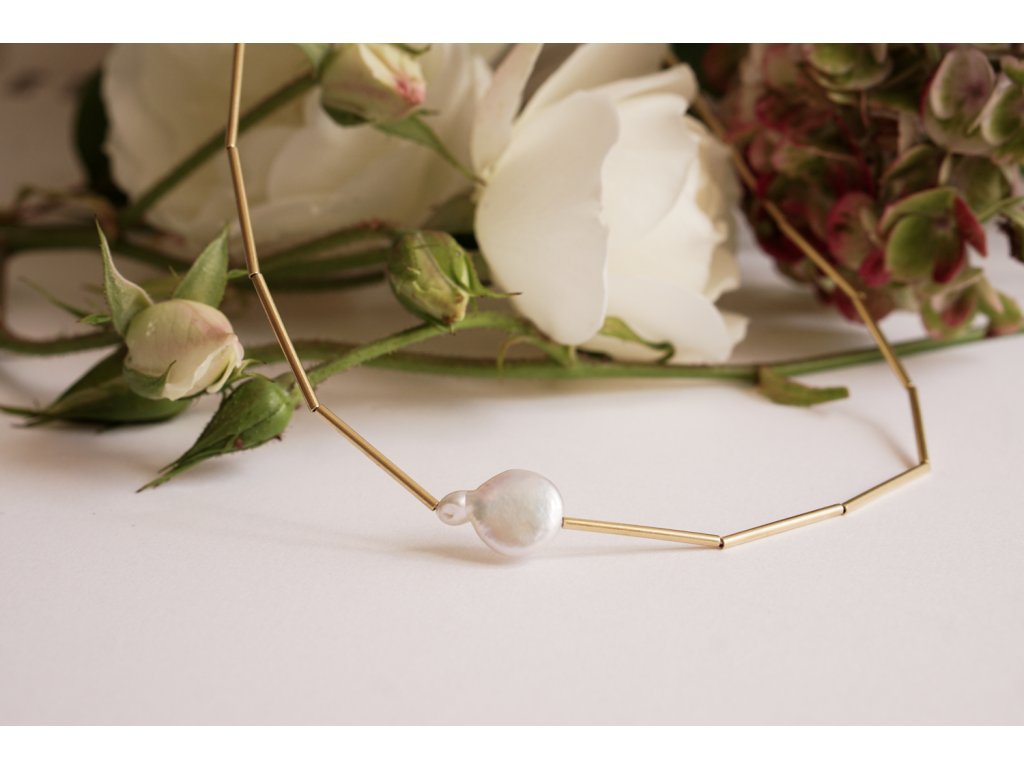 Řada za sebou těsně jdoucích teček - d o t s, které utváří vizuální LINKU. Kolekce LINE navazuje, jak už je zřejmé, na kolekci DOTS. Jednoduchost a strohost tvaru dodává kolekci LINE až architektonický ráz. Náhrdelník sestává z pozlacených stříbrných tyčinek o délce 20 mm a ryzosti Ag 925/Au 585, který je zjemněn barokní sladkovodní perlou (leaf pearl) v délce 20 mm. Barokní perly jsou výjimečné svou unikátností a neopakovatelností. Každá perla je jedinečná jak tvarem tak i barvou. Celková délka náhrdelníku je 42 cm.