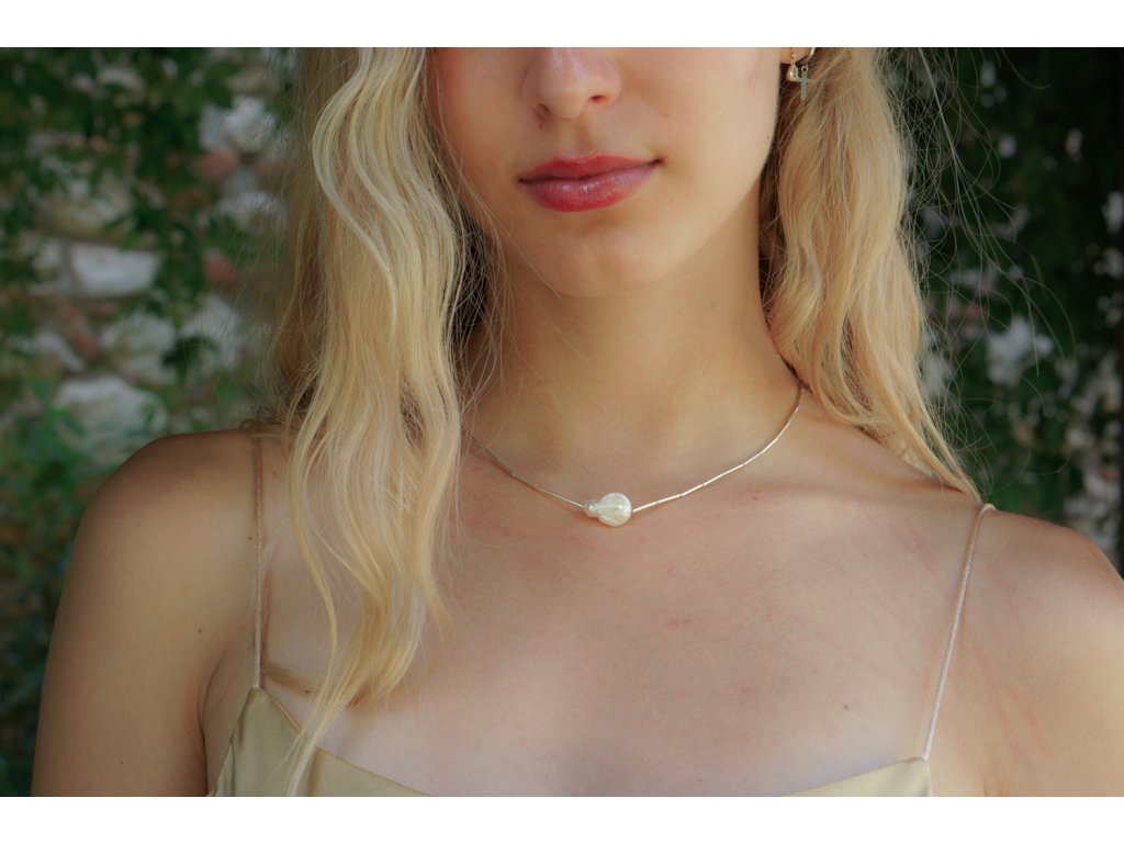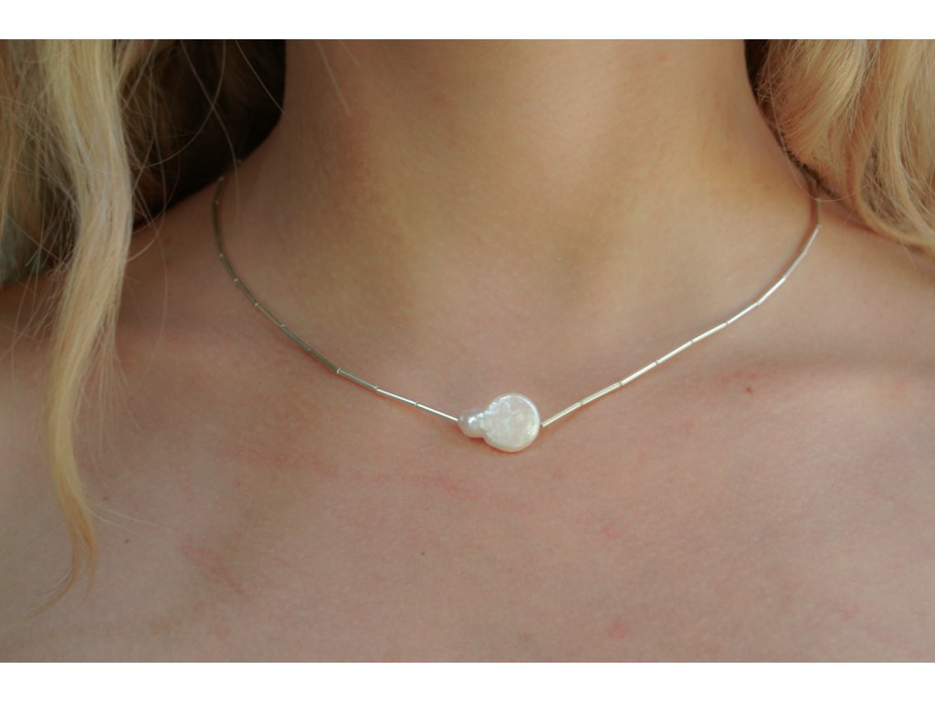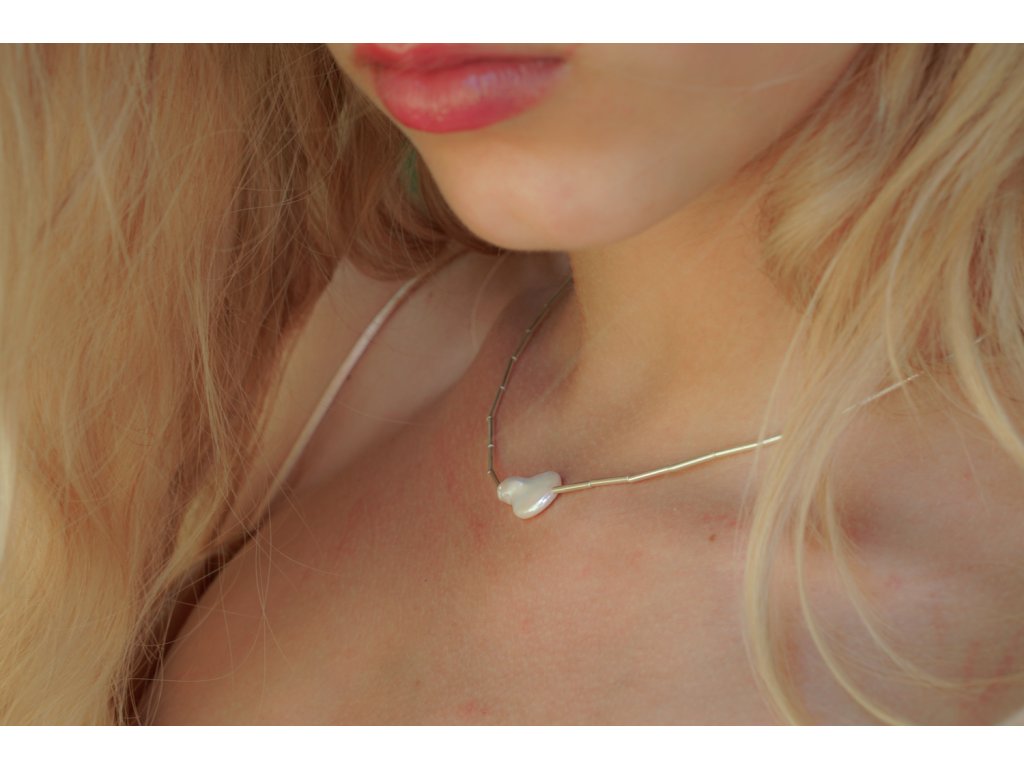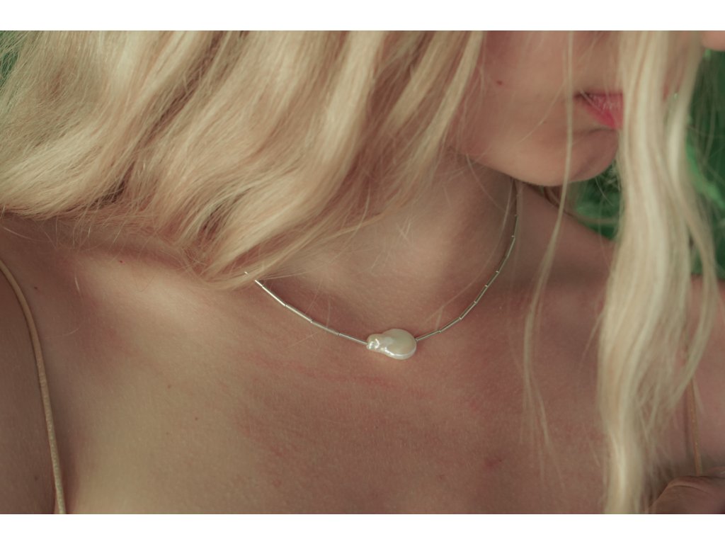 Řada za sebou těsně jdoucích teček - d o t s, které utváří vizuální LINKU. Kolekce LINE navazuje, jak už předešlá věta napovídá, na kolekci DOTS. Jednoduchost a strohost tvaru dodává kolekci LINE až architektonický ráz. Náhrdelník sestává ze stříbrných tyčinek o délce 15 mm a ryzosti Ag 925, který je zjemněn barokní sladkovodní perlou (leaf pearl) v délce 20 mm. Barokní perly jsou výjimečné svou unikátností a neopakovatelností. Každá perla je jedinečná jak tvarem tak i barvou. Celková délka náhrdelníku je 42 cm.