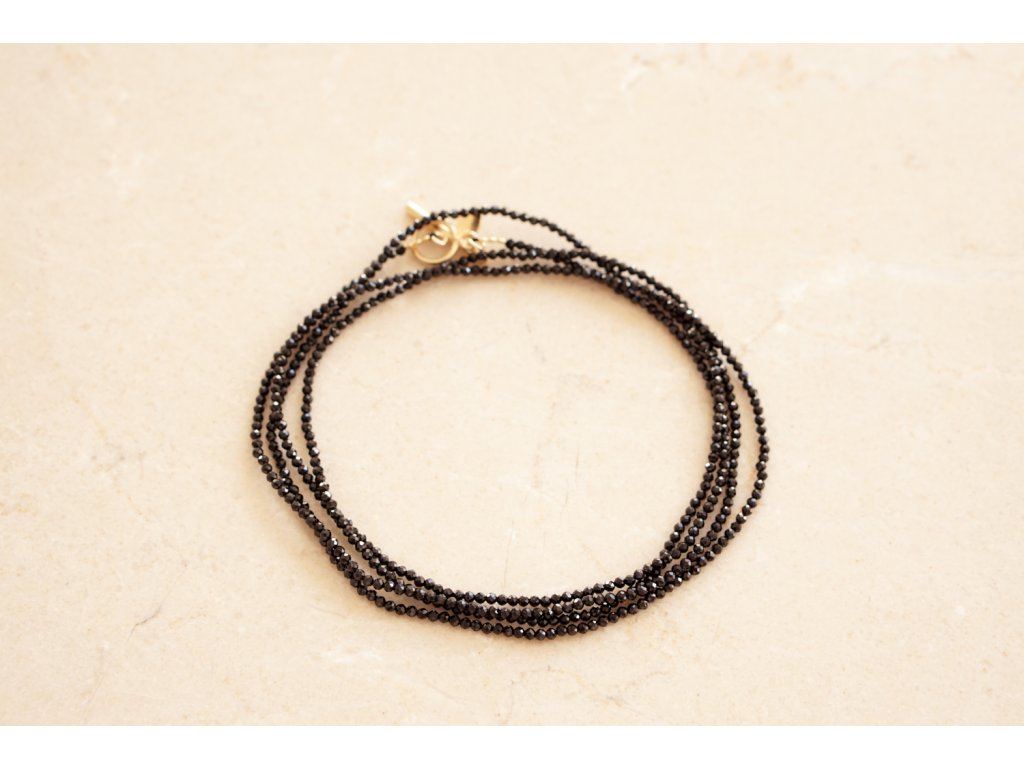 Náhrdelník je sestaven z 2 mm velkých korálků spinelu, navlečen na odolném hedvábí s pozlacenou stříbrnou americkou záponkou o ryzosti Ag 925/Au 585.
